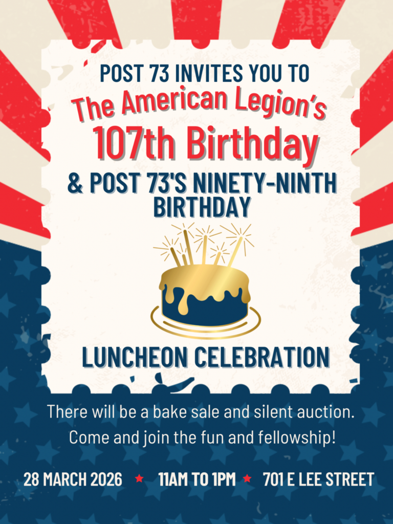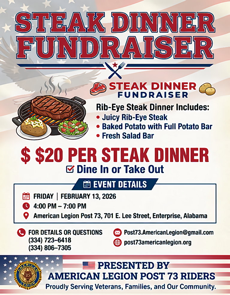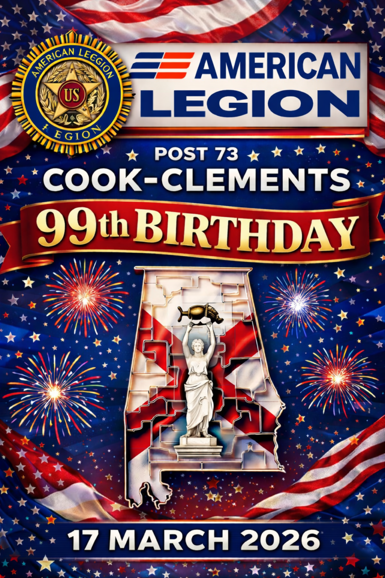 POST 73 UPCOMING EVENTS OZARK AL 2026 CRAWDAD FESTIVAL && LEGION RECRUITMENT STATION 28 MARCH 2026 1100-1300 // COMBINED BIRTHDAY PARTY HAPPY BIRTHDAY, POST 73 / COOK-CLEMENTS !! HAPPY BIRTHDAY, POST 73 !! HAPPY BIRTHDAY, AMERICAN LEGION !! 1919 STEAK NIGHT - 13 FEB 2026 COOKIES WITH SANTA CLAUS